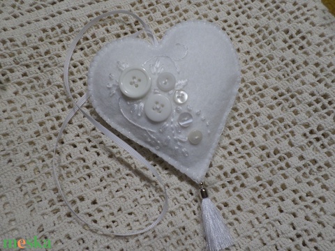 Hófehér gyapjú filc szív gombokkal, hímzéssel. Ajtó,-ablak,-kilincs dísz, dekoráció.