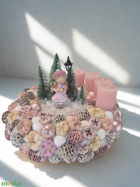 Rózsaszín–pasztell adventi kézműves koszorú angyallal