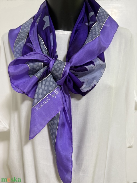 „Csillagfény-lila álom” – kézzel festett, 90×90 cm-es, 100% valódi hernyóselyem kendő