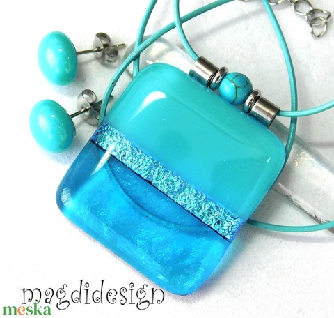 Türkiz-kék színtrió üvegékszer szett nyaklánc stiftes fülbevaló