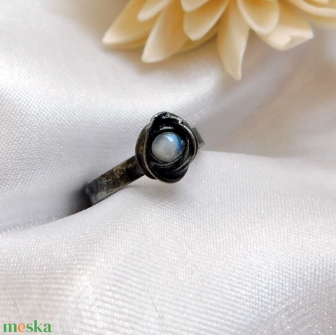 A gyűrű Tiffany technikával készült holdkő és ólommentes, ezüsttartalmú ón felhasználásával. A díszítés szintén saját készítésű, nem tartalmaz gyári elemeket. A fémrészt óezüstre patináztam és lelakkoztam, hogy sokáig szép maradjon.