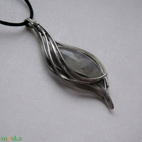 A medál Tiffany technikával készült holdkő és ólommentes, ezüsttartalmú ón felhasználásával. A díszítés szintén saját készítésű, nem tartalmaz gyári elemeket. A fémrészt óezüstre patináztam és lelakkoztam, hogy sokáig szép maradjon.