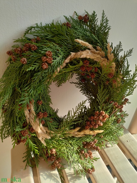 Átmeneti kopogtató természetes alapanyagokból - tuja koszorú - natúr ajtódísz tujával - téli örökzöld kopogtató