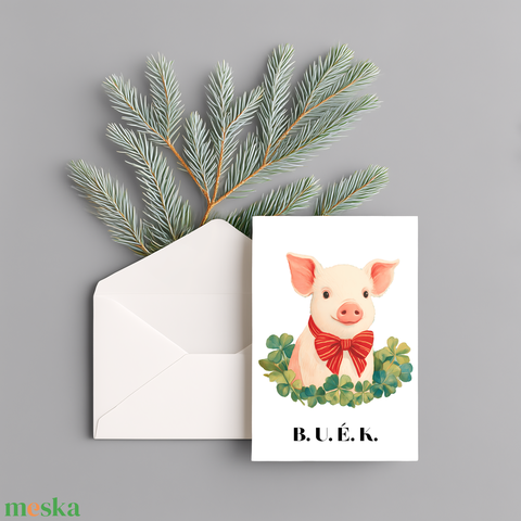 Újévi kinyitható képeslap borítékkal – Kismalac négylevelű lóherékkel mintával
