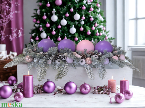 Kendekor természetes hatású adventi asztaldísz – lila-rózsaszín gyertyás, havas fenyős koszorú