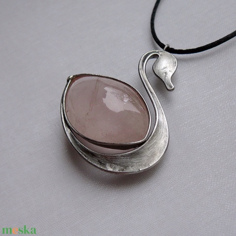 A medál Tiffany technikával készült rózsakvarc és ólommentes, ezüsttartalmú ón felhasználásával. A díszítés szintén saját készítésű, nem tartalmaz gyári elemeket. A fémrészt óezüstre patináztam és lelakkoztam, hogy sokáig szép maradjon.