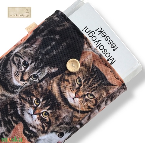 Könyvtok, cica mintával, vízálló textilből, gombos zárral - Artiroka design