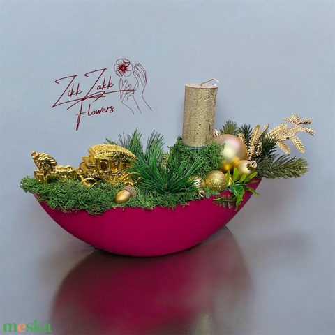 Bordó kaspós karácsonyi kompozíció arany figurával