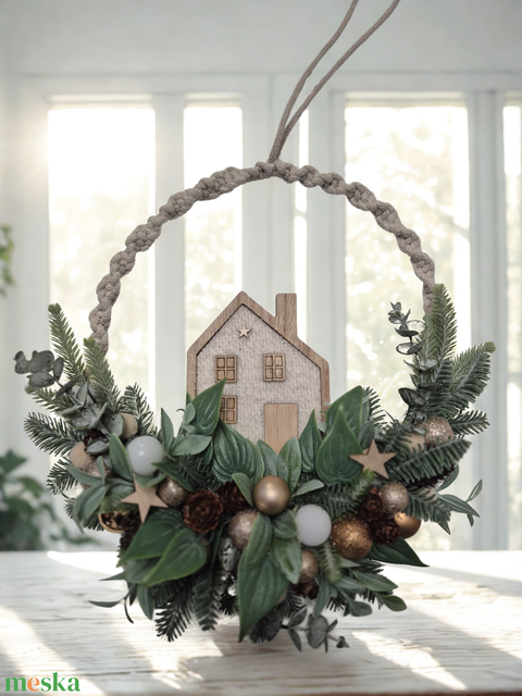 „Téli Házikó” kézműves ajtódísz / kopogtató – KENDEKOR – 32–34 cm