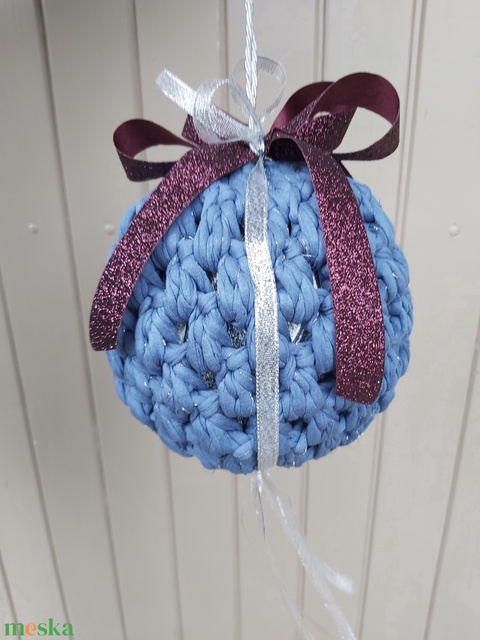 Kék színű pólófonallal és aranyszállal kézi horgolással készült óriás méretű gömb függődísz, tetején bordó csillámos és ezüst színű masnikkal. A dísz belseje ezüst színű műanyag gömb, melynek színe átcsillan a horgolásminta részletein. A dísz magassága masni nélkül 20 cm, masnival 23 cm.