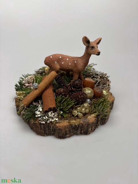 Fakorongra épült minidísz pettyes szarvas figurával, termésekkel, s egyéb növény részekkel gazdagon díszítve (FX-28)
