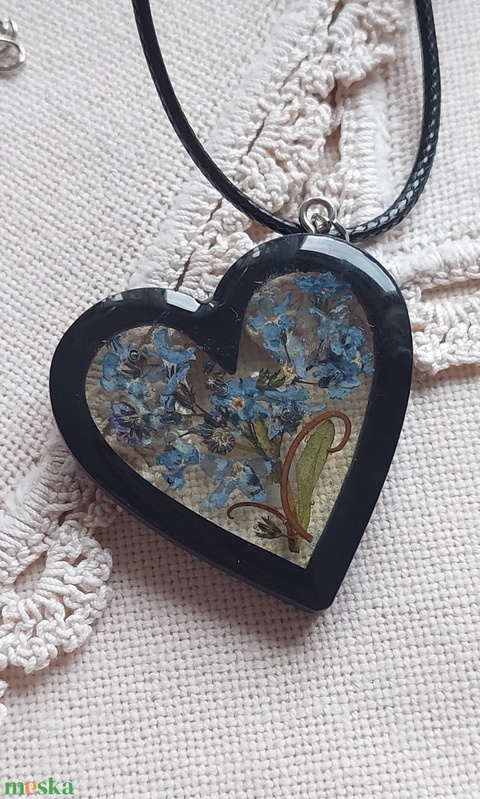 Kék nefelejcs szív alakú gyanta medál. Fekete fakeretes gyanta nyakék. Természetes ékszer.
