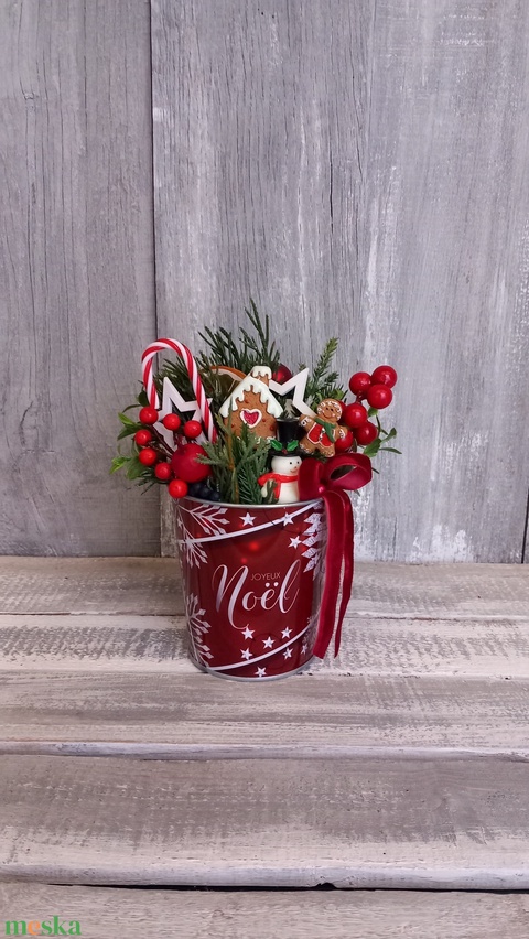 - Anyaga: kaspó, műzöldek, műbogyók, karácsonyidíszek, szalag