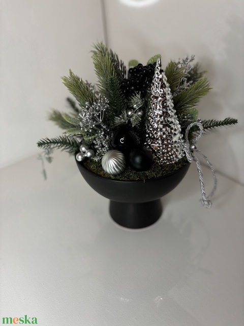 Adventi, karácsonyi, modern asztaldísz, kandallódísz, ezüst-fekete