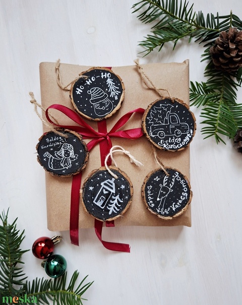 Boldog karácsonyt! Karácsonyi fakorongok 5 db, ajándékkísérők, karácsonyi dekoráció