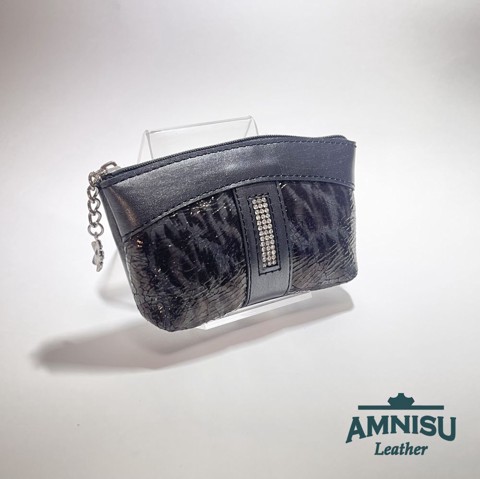 Sötét ezüst - párduc mintás egy cipzáras egyenes kristály köves kulcstartó E8001