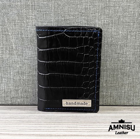 Fekete krokodil mintázatú marhabőrből készült minimalista férfi pénztárca. Kis méretének köszönhetően könnyen elfér zsebben, illetve kisebb táskában. RFID védelemmel ellátott, miszerint megakadályozza a bankkártya érintéses fizetéseit. Enyhén fényes, kényelmes tapintású a tárca. Belsejében 4 kártyatartó fakk található, ezek mögött kapott helyet a papírpénztartó rész, melyben félbehajtva férnek el a bankjegyek. Nem rendelkezik aprópénztartóval. Annak ajánljuk, aki az iratokat, bankkártyát szeretné benne tárolni, emellett kevés készpénzt is hord magával. Ez a modell kék színű bőrvarró cérna felhasználásával készült, természetesen más színnel is kérhető. Mérete: 7,5 * 10,5 * 1,5 cm Rendelhető, elkészítési idő: 1-2 hét. Egyedi elképzelés esetén keressen fel bátran, és megbeszéljük a részleteket!