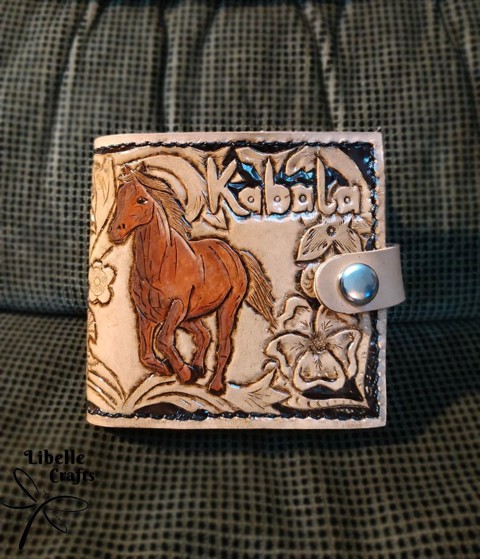 Megrendelésre készült natúr színű marhabőrből készült pénztárca, egyedi, lovas mintával, illetve a tulajdonos lovának nevével ellátva. A minta poncolt, a ló felszívódó bőrfestékkel festett, a többi motívum barna-natúr antikolás technikával festett. Fényes lekezelt felülettel rendelkezik, amely kiemeli a bőr szépségét és biztosítja a tartósságát. 3 db kártya fér el benne, illetve a kártyatartó alatt van egy külön fakk. Rendelhető, elkészítési idő: 2-4 hét. Egyedi elképzelés esetén keressen fel bátran, és megbeszéljük a részleteket!