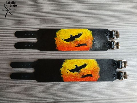 Egyedi megrendelésre készült páros karpánt. Színes hátérrel, közepén fekete repülő madár szimbólum található, melyet fontos jelentőséggel bír a megrendelőnek. A karpánt fekete marhabőrből készült, a minta felszívódó bőrfestékkel festett. Tartós, lekezelt felületű. Férfi és női méretben készült személyre szabva, csatos összekapcsolási lehetőséggel. Rendelhető, elkészítési idő: 1-2 hét. Egyedi elképzelés esetén keressen fel bátran, és megbeszéljük a részleteket!