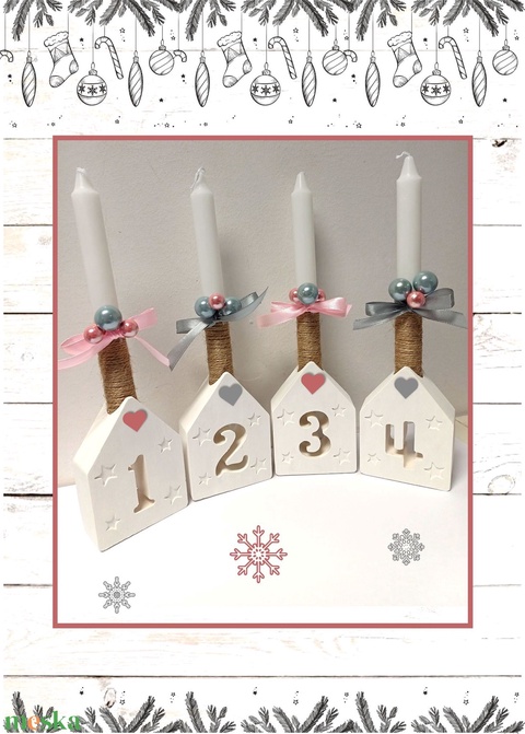 - Anyaga: kerámiapor, gyertya, szaténszalag, karácsonyi dekorgömbök