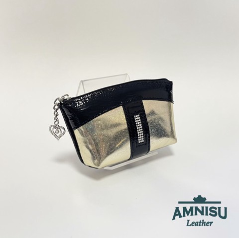Fekete gyűrt lakk - hologramos arany egy cipzáras egyenes kristály köves kulcstartó E8007