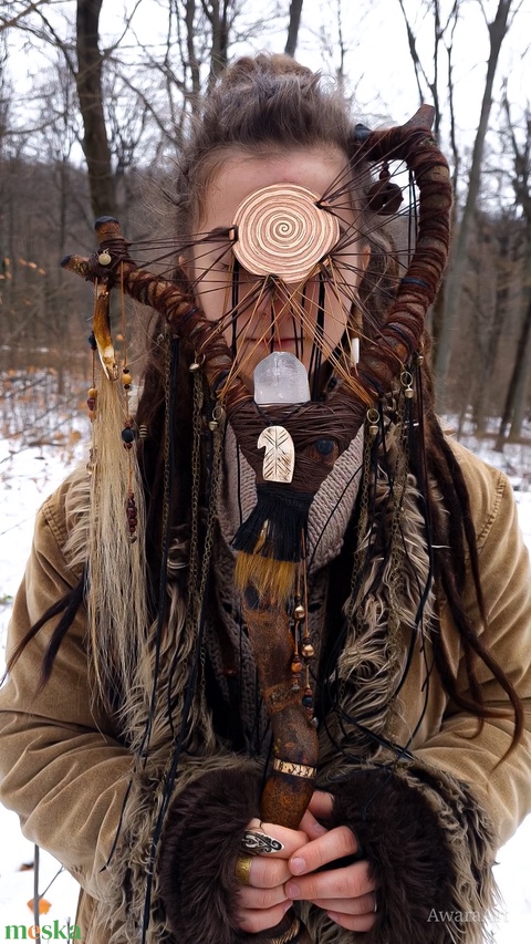 - Anyaga: csavart fűzfa, ásvány, réz, rézkorong, zsineg, csengettyű, lószőr, szőr, sörény, kristály