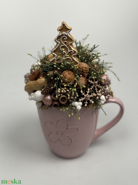 Mályva bögrére épült, mézeskalács fenyőt formázó kiegészítővel díszített adventi asztaldísz örökzöldekkel (XM-37)