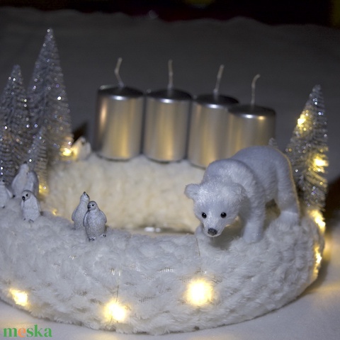 - Anyaga: szalma alap, műanyag állatfigurák, műfenyő, textil, led
