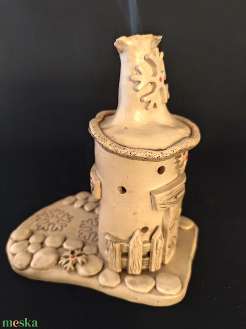 Fehér agyagból készült, 1x égetett füstölő és mécsestartó. Barna kerámia mázzal van bemosva , majd piros akril festékkel és lakkal van égetés után lekenve. A házikó 18cm magas, 7cm széles. A talpa 16cm x12cm. A füstölő házikó kúpfüstölővel és mécsessel is használható.