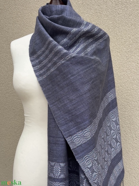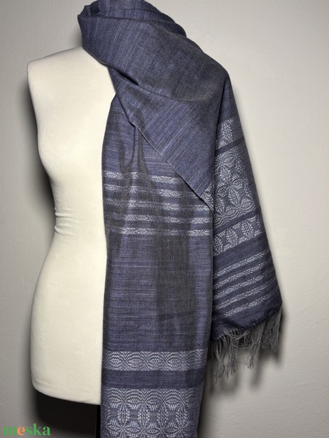 Kézzel szőtt kékesszürke hernyóselyem kendő liliom mintával – Egyedi kézműves női kiegészítő