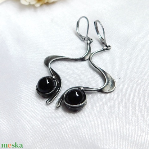 A fülbevaló tiffany technikával készült ónix gyöngyök, ólommentes, ezüsttartalmú ón és réz felhasználásával. A díszítés szintén saját készítésű, nem tartalmaz gyári elemeket. A díszítés szintén saját készítésű, nem tartalmaz gyári elemeket.A fémrészt óezüstre patináztam és lelakkoztam, hogy sokáig szép maradjon.