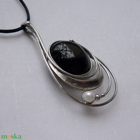 A medál Tiffany technikával készült fekete turmalin ( sörl ) és ólommentes, ezüsttartalmú ón felhasználásával. A díszítés szintén saját készítésű, nem tartalmaz gyári elemeket. A fémrészt óezüstre patináztam, lekezeltem antioxidánssal és lelakkoztam, hogy sokáig szép maradjon.