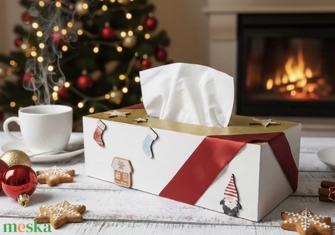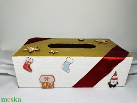 - Anyaga: zsebkendőtartó, akril, festék, ragasztó, lakk, műanyag díszek, szalag, fa díszek