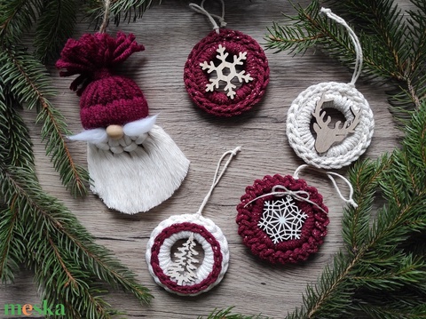 Horgolt karácsonyfadísz szett bordó-natúr színben