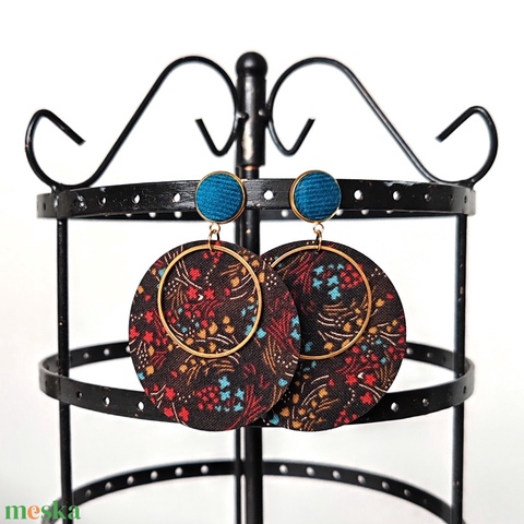 Őszies, mintás barna-türkiz nagyméretű textilfülbevaló aranyozott nemesacél alkatrészekkel