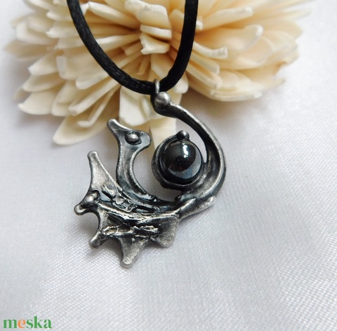 A medál Tiffany technikával készült hematit és ólommentes, ezüsttartalmú ón felhasználásával. A díszítés szintén saját készítésű, nem tartalmaz gyári elemeket. A fémrészt óezüstre patináztam és lelakkoztam, hogy sokáig szép maradjon.
