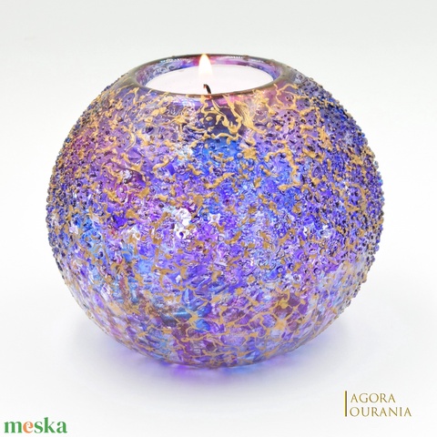 átlátszó üveg mécsestartó, arany üvegfesték, kék lila üvegfesték
