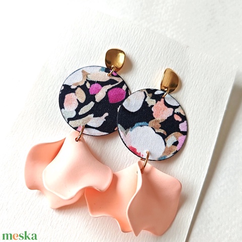 Sötétkék virágmintás textilfülbevaló barackszínű szirmokkal