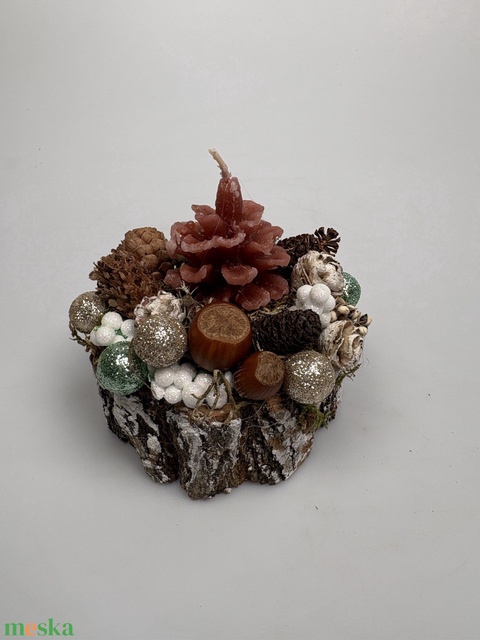 Toboz formájú gyertyával ékesített, fakorongra épült adventi asztaldísz némi csillogással (XF40)