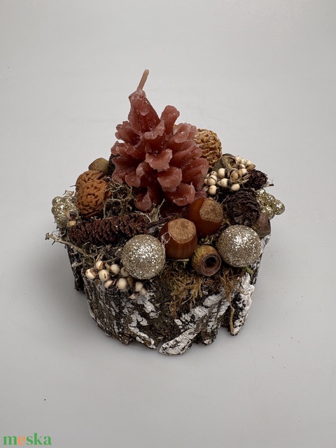 Pezsgő színű csillogással felszerelt, toboz formájú gyertyával ékesített, fakorongra épült adventi minidísz (XF41)