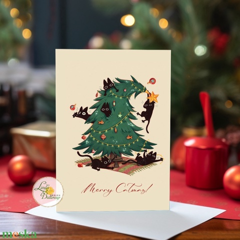 vicces cicás karácsonyi képeslap, cicás, cica, macska, karácsonyfa, üdvözlő lap, képeslap, BORÍTÉKKAL