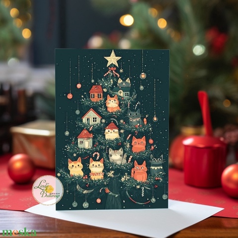 vicces cicás karácsonyi képeslap, cicás, cica, macska, karácsonyfa, üdvözlő lap, képeslap, BORÍTÉKKAL