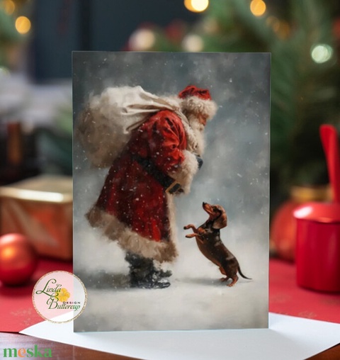 aranyos tacskós karácsonyi képeslap, mikulás, tacskó, tacsi, kutyás, üdvözlő lap, képeslap, BORÍTÉKKAL