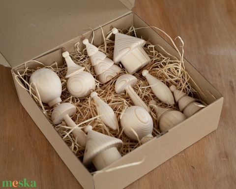 12 darabos kézzel esztergált fa karácsonyfadísz szett – kreatív, festhető, natúr, rusztikus vintage dekoráció