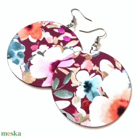Meleg barna alapon rózsaszín, kékes, narancsos nagy virágmintás textilfülbevaló