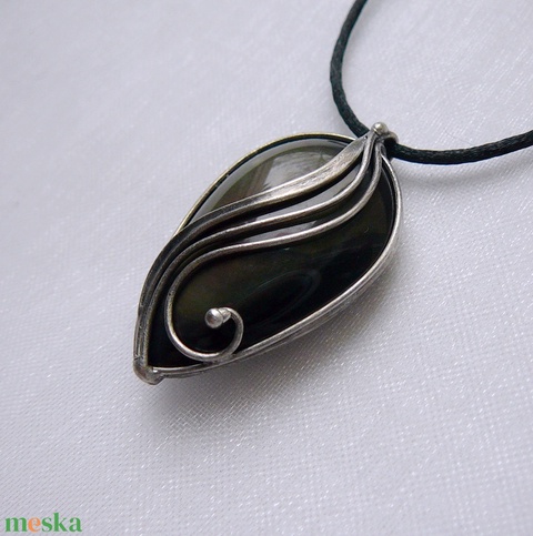 A medál Tiffany technikával készült szivárvány obszidián és ólommentes, ezüsttartalmú ón felhasználásával. A díszítés szintén saját készítésű, nem tartalmaz gyári elemeket. A fémrészt óezüstre patináztam, lekezeltem antioxidánsal és lelakkoztam, hogy sokáig szép maradjon.