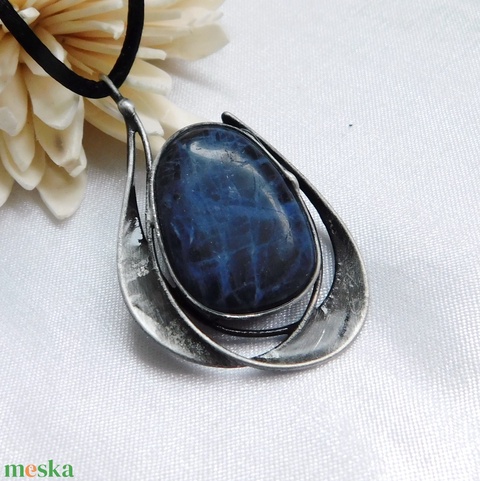 A medál Tiffany technikával készült szodalit, réz és ólommentes, ezüsttartalmú ón felhasználásával. A díszítés szintén saját készítésű, nem tartalmaz gyári elemeket. A fémrészt óezüstre patináztam és lelakkoztam, hogy sokáig szép maradjon.