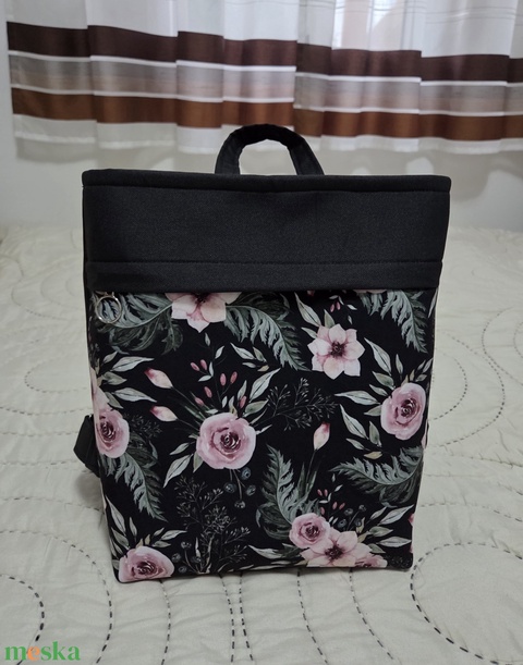 Hátizsák fekete-rózsaszín virágmintás