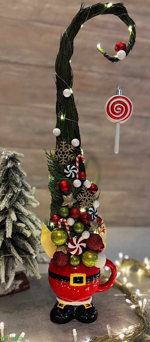 - Anyaga: kerámia bögre, oázis, drót, led izzósor, díszek, műanyag nyalóka, műanyag cukorka, zanót, tuja