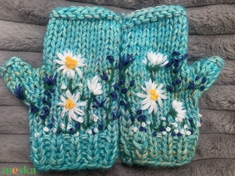 Kézi kötésű ujjatlan kesztyű világos kék melírozott gyapjú fonalból kézzel kötött, fehér virágokkal hímezve eladó
